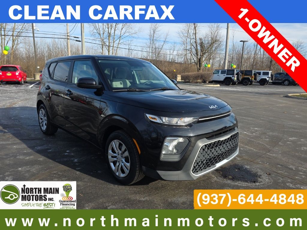 CARFAX One-Owner. North Main Motors is delighted to offer this gorgeous-looking 2022 Kia Soul LX In Cherry Black. This vehicle is beautifully equipped with 16″ x 6.5″ Alloy Wheels, 16″ x 6.5″ Steel Wheels, 4-Wheel Disc Brakes, 6 Speakers, ABS brakes, Air Conditioning, AM/FM radio, Apple CarPlay & Android Auto, Brake assist, Bumpers: body-color, Carpeted Floor Mats, Delay-off headlights, Driver door bin, Driver vanity mirror, Dual front impact airbags, Dual front side impact airbags, Electronic Stability Control, Exterior Parking Camera Rear, Front anti-roll bar, Front Bucket Seats, Front Center Armrest, Front reading lights, Front wheel independent suspension, Fully automatic headlights, Illuminated entry, Low tire pressure warning, Occupant sensing airbag, Outside temperature display, Overhead airbag, Overhead console, Panic alarm, Passenger door bin, Passenger vanity mirror, Power door mirrors, Power steering, Power windows, Radio: AM/FM/MP3 Audio System, Rear window defroster, Rear window wiper, Remote keyless entry, Remote Start, Speed control, Speed-sensing steering, Split folding rear seat, Steering wheel mounted audio controls, Tachometer, Telescoping steering wheel, Tilt steering wheel, Traction control, Trip computer, Variably intermittent wipers, and Woven & Tricot Cloth Seat Trim! From the moment you step on our lot until the time you drive away in your next car, your buying experience with North Main Motors is our number one priority. We encourage you to use the expertise and resources of our sales staff – they are here to help you find the right car at the right price. Call us today at 937-644-4848 to schedule your test drive!